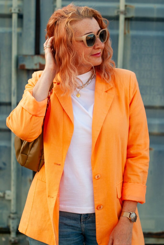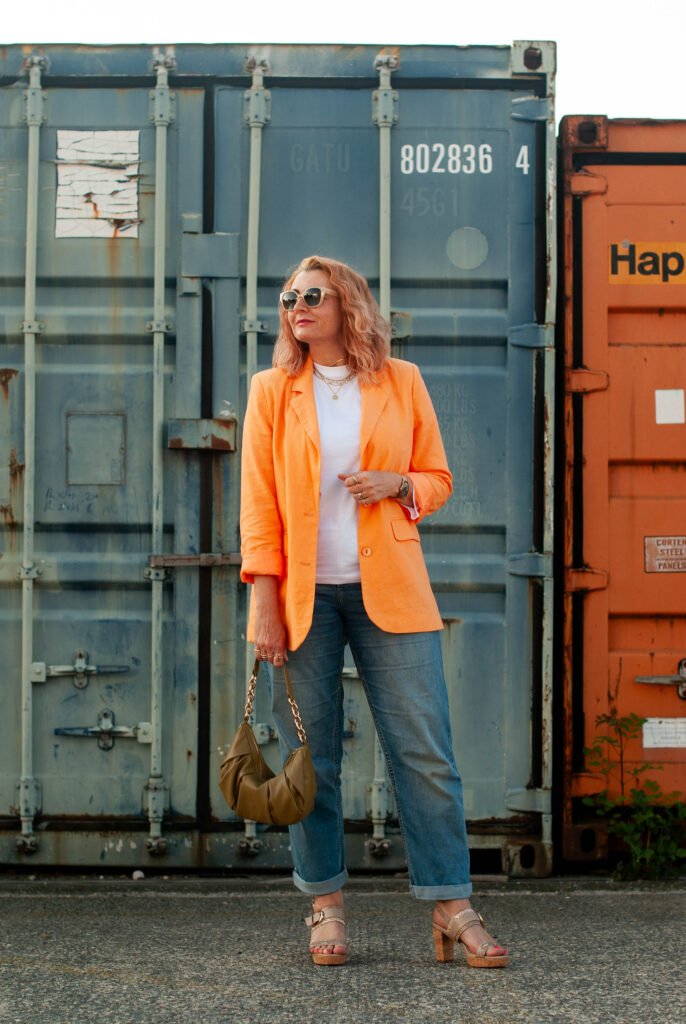 • With a blazer when I want to dress things up a bit—pairing the relaxed tee with a structured piece elevates the look.